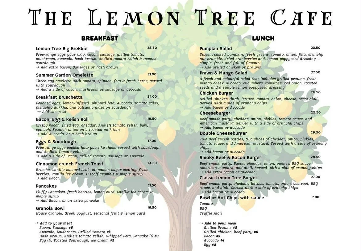 Please go to Facebook or Instagram to find out more about The Lemon Tree Cafe Geurie.